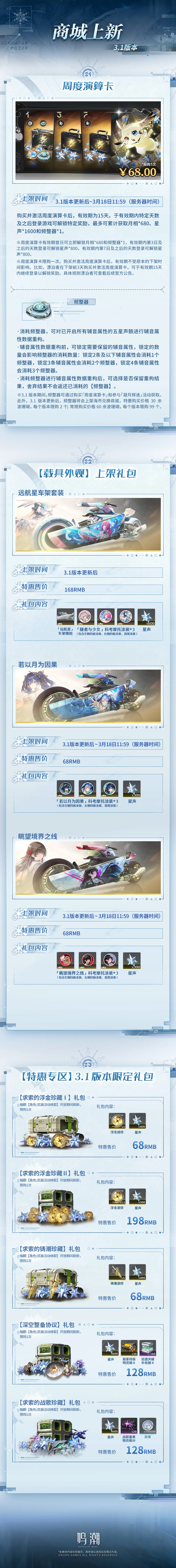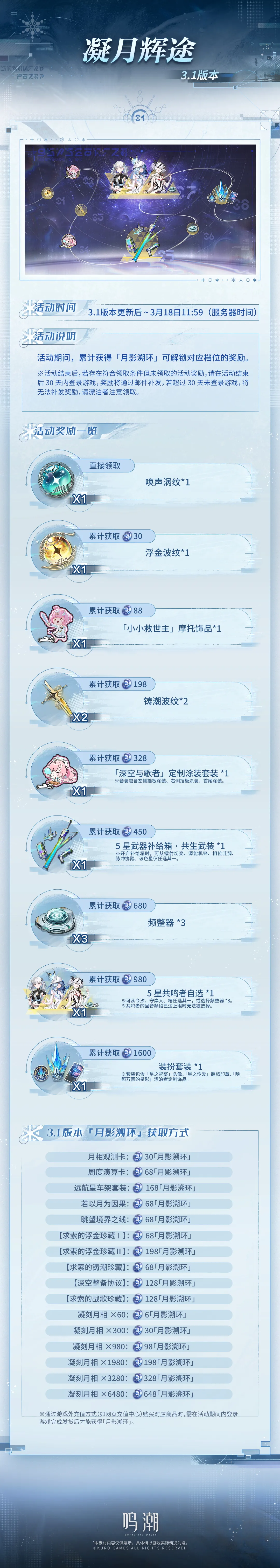本期为漂泊者带来3.1版本中「长迹伴行」回馈系统、「凝月辉途」限时活动和「商城」内容的具体资讯。此外,活动期间漂泊者可免费领取1600星声、高级定制服饰「星火永明」等奖励,欢迎漂泊者查看!
